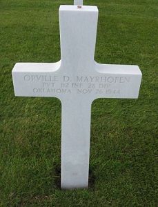 Pvt Orville D. `Bud` Mayrhofen died at the Battle of the Hurtgen Forest.He was employed as an automobile mechanic at Granite, Greer County, for some time prior to entering the army. He was employed at the Johnson Garage when he was inducted into the service on 28 March 1944.