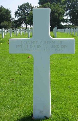 Pvt Lonnie Green was one of a small number of African-American soldiers who were allowed to volunteer for combat duty in January and February 1945, due to the need of infantry soldiers. After training, a 240-man company was assigned to the 14th Armored Division and were attached to the 19th Armored Infantry Battalion as the CCR Rifle Company.It is most likely that Pvt Green was captured by the Germans during the fighting at or near Frickenhausen on 5 April 1945 and died on 6 April 1945.