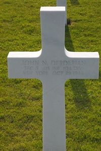T/5 Derderian was killed by shrapnel in the side. He was initially buried in a temporary grave at Henri-Chapelle on 31 October 1944. He was disinterred in 3 November 1947 and his remains were prepared and placed in a casket the same day. He was given his final resting place on 21 August 1948.