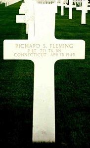 2nd Lt Richard S. Fleming was attending Yale in 1942 with the Class of 1945) when he withdrew and enlisted at Fort Knox on 11 September 1942. He attended Armored Forces Officer Candidate School, Fort Knox, and was commissioned a Second Lieutenant a year later.He was asked to lead a dismounted reconnaisance to determine the locations of enemy positions accross the Elbe river. He was machine gunned along with two others (one of whom survived).