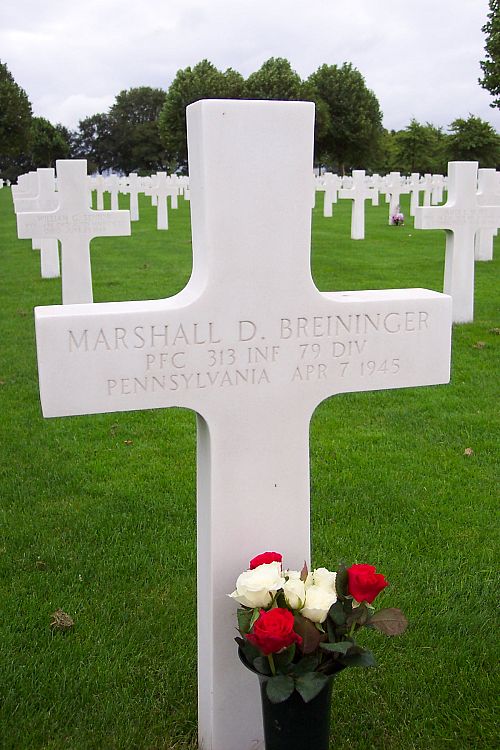 Marshall Breininger was killed by a German sniper.Source of information: Astrid van Erp, www.wwiimemorial.com, www.fold3.com, www.ancestry.com - Headstone and Interment Record / Family Tree / Veteran Compensation Application File / 1920 Census
