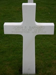 Pvt John R. Barnard enlisted at Fort Lewis, Washington on 12 June 1944. He attended high school for one year.Source of information: Peter Schouteten, Astrid van Erp, Terry Hirsch, www.wwiimemorial.com, www.archives.gov, www.ancestry.com - Headstone and Interment Record / Family Trees / U.S. WWII Draft Cards Young Men / WWII Enlistment Record