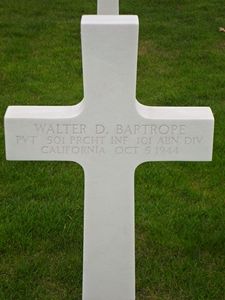 Walter Bartrope enlisted on 30 January 1943 at Sacramento, California.He was first buried at the Temporary American Military Cemetery of Molenhoek, The Netherlands