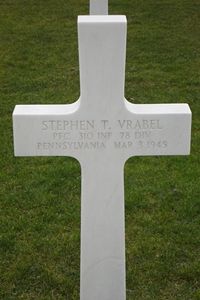 Pfc Stephen T. Vrabel enlisted in Pittsburgh, Pennsylvania on 31 August 1944.Source of information: Astrid van Erp, Peter Schouteten, Carla Mans, www.wwiimemorial.com, www.fold3.com, www.archives.gov - WWII Enlistment Record, www.ancestry.com - U.S. WWII Draft Cards Young Men