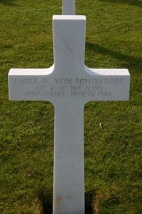 T/4 Earle V. Von Schondorf attended schools in Hoboken and was employed by the Art Color Printing Company.He enlisted in Trenton, New Jersey on 28 January 1941. He was overseas for about two years and had seen action in Tunisia, Sicily, Italy, France, Belgium and Germany.