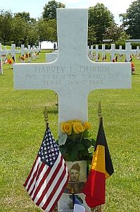 Harvey Durbin joined the Army on 2 July 1942.He was awarded the Silver Star Medal posthumously for his action on 12 January 1945. The citation cited: On the morning of 12 January 1945, at about 1030 hours, Company D, 83d Armored Reconnaissance Battalion and an attached platoon of tanks were given the orders to attack and wipe out enemy positions about two miles south of Bihain, Belgium. Company D, acting as infantry, was proceeding through wooded, snow-covered territory toward its objective when the enemy opened with continuous small arms and mortar fire. The platoon of tanks was then sent forward in an effort to wipe out the enemy resistance. The tanks withdrew to more favorable positions and our infantrymen were sent in to engage the enemy. At this time, Pvt Durbin went forward in the face of intense small arms and bazooka fire, with complete disregard for his own safety, opened fire upon the enemy bazooka teams, inflicting casualties upon them and causing the remainder of the bazooka teams to retreat. During this action, Pvt Durbin was slightly wounded in the leg but continued to fire upon the enemy until he was seriously wounded my mortar fire. Pvt Durbin's action in causing the enemy to retreat from their entrenched positions was the decisive factor in enabling our tanks to move forward and wipe out the enemy positions in that area. His bravery and devotion to duty and his determined effort to close with the enemy regardless of the consequences, was an inspiration to his comrades and reflect great credit upon himself and the Armed Forces of the United States.