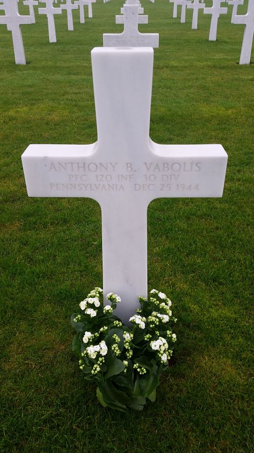 Pfc Anthony B. Vabolis attended high school for 4 years and worked in a mchine shop. He enlisted at Wilkes Barre, Pennsylvania on 4 March 1943. He trained at Fort Jackson, South carolina and Camp Atterbury, Indiana. He was sent overseas in July 1944.On 25 December 1944, Malmédy was mistakenly bombed by American bombers for the second time. The bombers crews thought they were over their target, St. Vith. At the time M Company's kitchen was situtated in Hotel De La Poste, better known as Hotel Nicolette. The company suffered 14 men killed, 2 wounded, 2 seriously wounded and 3 lightly wounded. It can be assumed that Pfc Vabolis was one of the casualties.