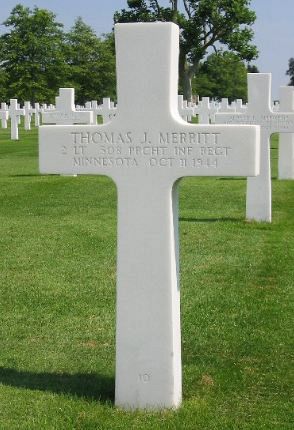 2nd Lt Thomas J. Merritt attended Shattuck Military Academy in Faribault, Minnesota and was an avid hockey player.He enlisted following graduation and entered basic training immediately after leaving school. On completion of basic training he was assigned to the Officer Candidate School at Fort Benning, Georgia and was commissioned in December 1943 when he was 18. Lt Merritt was sent to England in June 1944 and was trained to become a paratrooper in that country. He didn't participate in the Normandy invasion. He was assigned to the 508th as a replacement platoon commander in C Company.