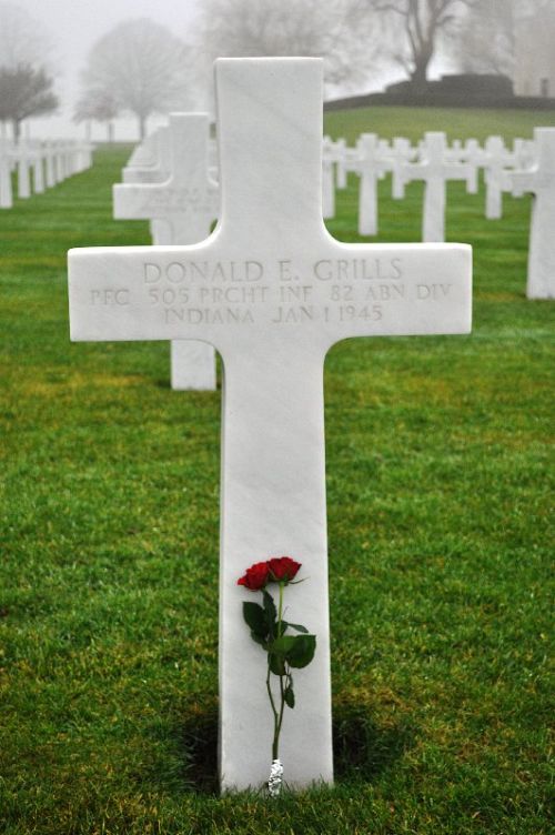 Pfc Donald E. Grills attended Hammond High School and graduated in the class of 1941. He was on the wrestling team and served as the Secretary of the Science and Radio Club. After high school he studied at Indiana University for a year and worked for Republic Steel.He volunteered for the Army of the United States at Fort Wayne, Indiana on 21 July 1942.