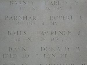 S/Sgt Lawrence J. Bates was sent overseas in October 1943.The Missing Report of 10 November 1944 indicates that L Company was assigned the mission to occupy Schmidt. The enemy overran and encircled the position, forcing withdrawal. Upon reorganization and check, Sgt Bates was not present. Eyewitness statements indicate that Sgt Bates' death was the result of a direct hit from enemy artillery fire.