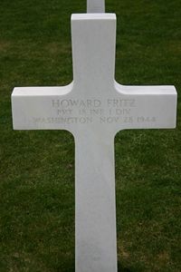 Pvt Howard Fritz enlisted in Spokane, Washington on 15 March 1944. He attended high school for 2 years and worked on a farm before he enlisted.Source of information: Astrid van Erp, Raf Dyckmans, Carla Mans, www.wwiimemorial.com, www.findagrave.com, www.archives.gov, www.ancestry.com - U.S. WWII Draft Cards Young Men / 1940 Census, www.history.army.mil/html/bookshelves/resmat/ww2list.html