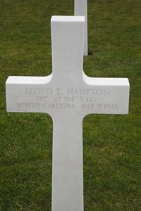 Pfc Lloyd E. Hampton served with the Infantry in the European Theater of Operations in France and Germany. He entered the service on 10 April 1944 and went overseas in September 1944.Source of information: Astrid van Erp, www.wwiimemorial.com, www.fold3.com, www.ancestry.com - A History of Cabarrus County in the Wars / Lindsey Family Tree