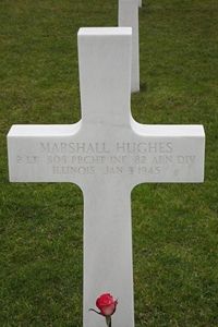 Marshall Hughes graduated from Groton High School and attended Harvard University for one year.He joined the U.S. Army Reserve at Fort Sheridan, Illinois, on 27 February 1945 and attended Officer Candidate School at Camp Davis.