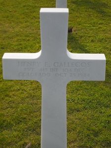 Pvt Henry E. Gallegos enlisted on 27 March 1942. He attended high school for 2 years and was married. He was employed at the Civilian Conservation Corps in Springfield, Colorado at the time he enlisted.Source of information: Astrid van Erp, Arjan van Hassel, www.wwiimemorial.com, www.fold3.com - WWII Draft Card, www.archives.gov - WWII Enlistment Record, www.ancestry.com - Headstone and Interment Records / 1940 Census
