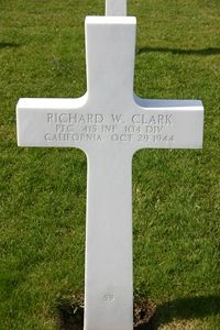 Pfc Richard W. Clark enlisted at Fort MacArthur San Pedro, California on 2 July 1943.He attended San Diego State University for 2 years. He was active in Alpha Phi Omega service fraternity. He never got a chance to appreciate the tourist spots he heard about. In a letter he wrote: "I had thought France was a gay, romantic country, but all I see is rain, mud ad people who look like those in ancient history books."