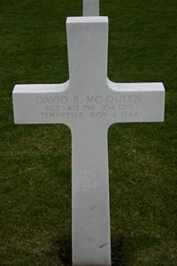 Sgt David R. Mc Queen worked in a textile factory before he enlisted at Fort Oglethorpe, Georgia on 3 November 1942.Source of information: Raf Dyckmans, Astrid van Erp, Arjan van Hassel, Peter Schouteten, Carla Mans, www.wwiimemorial.com, www.ancestry.com - Family Trees / Headstone and Interment Record, www.archives.gov - WWII Enlistment Record