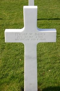 Pvt Edgar W. Baird enlisted on 8 May 1944 and trained at Camp Fannin, Texas. He went overseas on 5 November 1944.Source of information: Peter Schouteten, www.abmc.gov, www.wwiimemorial.com, www.ancestry.com - Various Family Trees, www.ivydivisionww2.com, www.newspapers.com - The Times Herald