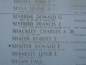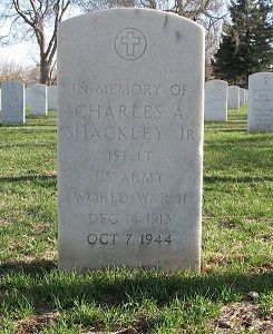 Lt Charles A. Shackley, Jr was awarded the Silver Star Medal posthumously. The citation cited: In two attacks on the front in France, Shackley's platoon destroyed three Mark V tanks and a French tank. On Oct. 6, he captured ninety-five prisoners. He was killed in action near Waurichen Germany, Oct. 7. The platoon's many successes were due to Shackley's leadership, initiative, skillful maneuver and heroism.He is remembered at Fort Logan National Cemetery in Denver, Denver County, Colorado.