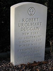 Robert U. Duggan enlisted in the USAAF on 22 January 1942 and was a replacement for this crew because the original navigator (Gill) was shot down just 10 days before.Returning from a bombing mission to Kassel, Germany the limping aircraft was attacked by a German fighter and was shot down. 8 crewmembers bailed out but were attacked by the German aircraft. From a crew of ten, two died in the aircraft, six died as a result of the strafing, and the other two were captured by German ground forces.
