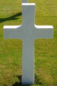 2nd Lt Charles W. Dickman was washed ashore near Seebad Warnemunde, Rostock. He was initially buried at the New Cemetery at Rostock on 26 April 1944. An American investigation team disinterred his remains between 9 and 11 April 1947 and evacuated them to Ardennes.