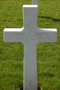 Pfc Samuel E. Jordan was a miner before he enlisted in Abingdon, Virginia on 31 March 1943.He was first buried at the Temporary American Military Cemetery of Foy, Belgium.