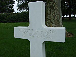 Pfc Ernest R. Newhook was a sailor before he enlisted in New York City, New York on 16 February 1943.The chaplain, Milton Berg, recalled what happened: "The mission of the company was to clear the woods in the vicinity of Rimbeck, Germany. He was coming over a field on his way back to the place where the platoon command post was located when a mortar shell landed near him. He was hit by fragments from this shell and was instantly killed."