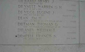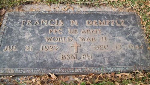 Pfc Francis N. Dempfle enlisted in Buffalo, New York on 12 February 1943.He was officially declared dead one day and one year after he was reported missing in action.