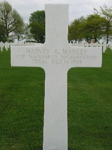 Lt Manley was initially buried in the Forrest Cemetery in Merkstein, Germany. He was evacuated to Margraten on 1 February 1945 and interred in a temporary grave. He was again disinterred on 20 July 1948 and his remains were prepared and placed in a casket on 21 July 1948. He was given his final resting place on 10 January 1949.