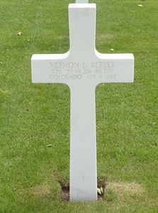 Cpl Vernon L. Berrey enlisted in Denver, Colorado on 30 January 1943. He attended college for 2 years and was a salesman before he enlisted.He suffered a shell fragment wound in his right side. He was initially buried at the Temporary American Military Cemetery in Breuna, Germany on 14 April 1945. Later, he was moved to Margraten and buried there in a temporary grave on 10 July 1945. He was again disinterred on 23 August 1948 and his remains were prepared and placed in a casket on 26 August 1948. He was given his final resting place at Margraten on 26 April 1949.