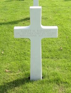 Cpl Albert H. Raposky attended high school for one year. He enlisted in Pittsburgh, Pennsylvania on 7 November 1942.Source of information: Terry Hirsch, www.wwiimemorial.com, Carla Mans, www.fold3.com, www.ancestry.com - WWII Enlistment Record / Headstone Inscription and Interment Record / Veteran Compensation Application File U.S. WWII Draft Cards Young Men / 1920/1940 Census‏
