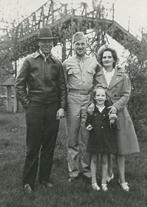 The third picture shows him in the middle with his stepfather William Sudo on his left and his mother Iva Bertha May (Lou) Horning Wood Sudo, and his niece Carole Wates.