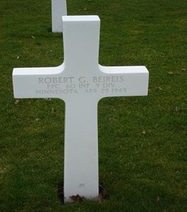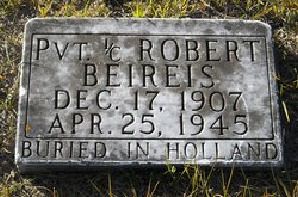 Pfc Robert G. Beireis was reported mortally wounded on 23 April 1945 and died in a hospital on the 25th.Source of information: Peter Schouteten, www.wwiimemorial.com