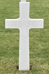 Pvt Wesley H. Doney was awarded the Silver Star Medal for moving through enemy occupied territory to repair a broken communications wire, which he successfully repaired and returned, despite being surrounded by the enemy.He was initially buried at the Temporary American Military Cemetery Foy, Belgium.