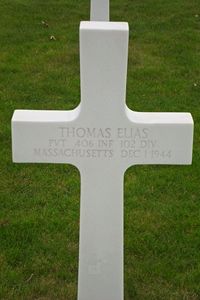 Pvt. Thomas Elias was a 1932 graduate of Norwood High School where he was a member of the Glee Club. Prior to entering the service in August 1943, he was employed at Bird & Son.Source of information: Astrid van Erp, Terry Hirsch, www.wwiimemorial.com, www.fold3.com, www.archives.gov, Morrill Memorial Library (Norwood, Massachusetts)