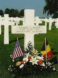 S/Sgt Wilbert J. Moser enlisted in Allentown, Pennsylvania on 1 December 1942. He arrived in Normandy on 8 June 1944 and was wounded in action a first time on 26 July 1944.Source of information: Raf Dyckmans, www.wwiimemorial.com, www.findagrave.com, www.fold3.com, www.archives.gov - WWII Army Enlistment Record