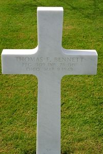 Pfc Thomas F. Bennett enlisted in Cincinnati, Ohio on 3 April 1943.Source of information: Peter Schouteten, Carla Mans, www.wwiimemorial.com, www.archives.gov - WWII Enlistment Record, www.ancestry.com - 1930/1940 Census / U.S. WWII Draft Cards Young Men