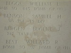 During an attack on an enemy pillbox in the vicinity of Harspelt, the tank in which Cpl Bergen was a crew member, was hit by anti-tank fire, forcing him to evacuate. T/5 Kenneth Fletcher, the gunner of the tank, stated on 17 July 1945 that he saw Cpl Bergen evacuate the tank and run towards and enter the closest enemy pillbox. He heard two shots from the pillbox as he entered. To the best of his belief, he firmly believed that Cpl Bergen was shot and killed as he entered the pillbox.In August 1947, an investigation of the area was conducted. A civilian stated that he found a human skull and an American shoe with a bone sticking in it, close to the tank of Cpl Bergen. The place was searched, but the remains were not found again. The knocked-out tank was still there. A careful search inside as well as the surrounding area and the pillbox close by did not reveal anything.