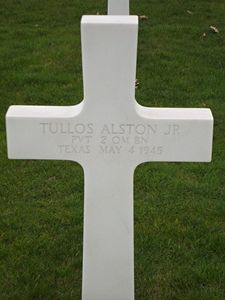 Tullos Alston enlisted on 17 February 1943 in Houston, Texas.Source of information: Peter Schouteten, Terry Hirsch, WWII Memorial, National Archives, www.ancestry.com - 1930 Census, www.fold3.com - WWII Draft Card