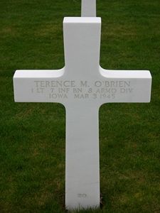 Terence M. O'Brien graduated from Davenport High School where he was a cadet colonel in the R.O.T.C. He attended St. Ambrose College and attended the University of Iowa where he received a M.A. degree.He enlisted on 29 August 1942 and graduated from Officers Candidate School at Fort Knox.