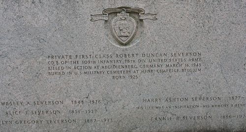 Pfc Robert D. Severson graduated from West High School in Rockford, Illinois in 1943 and attended the Massachusetts Institute of Technology (MIT).He is remembered in Rockland, Greenwood Cemetery at the family plot.