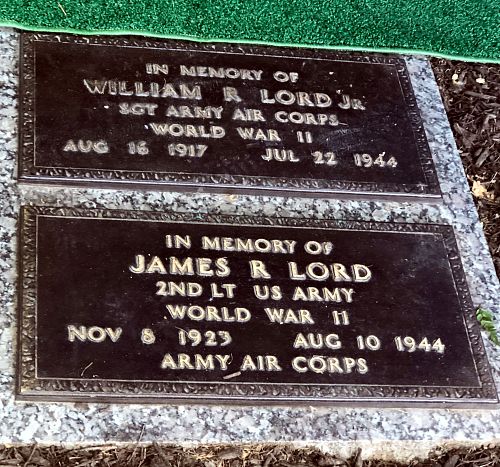 His brother, 2nd Lt James R. Lord, was killed in action on 10 August 1944 and is remembered on the Tablets of the Missing at Florence American Cemetery.