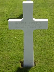 Pfc Harry Aschoff was a foreman before he enlisted in Newark, New Jersey on 10 January 1944.He joined his unit from replacement depot on 3 August 1944 and was lightly wounded in action on 11 September 1944. He was promoted to Pfc on 1 December 1944. He was killed by a mortar shell in a foxhole.