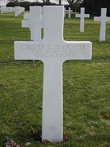 Chester C. Slaughter graduated from Mexia High School and worked as a cook.He joined the National Guard in Mexia, Texas on 25 November 1940 and was commissioned at Fort Benning, Georgia after completing Officer Candidate School. He was stationed at Camp Wolters, where he was in command of a rifle company and at Camp Maxey, Texas.