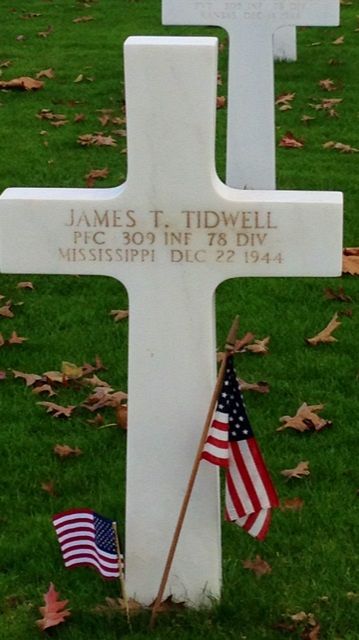 Pfc James T. Tidwell enlisted in Jackson, Mississippi on 5 September 1940.He is remembered at the Harlands Creek Cemetery in Coxburg, Holmes County, Mississippi.