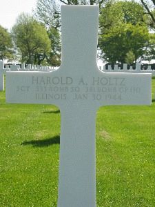Sgt Harold A. Holtz graduated from Dundee Community High School and was employed as a finisher at the Haeger Pottery Company.The airplane was attacked by German fighters before it reached the target area which knocked out #2 engine. Later it was hit by flak which caused the left wing to get on fire. Because it was unable to get the fire out, most of the crew abandoned the airplane near Deurne, the Netherlands.
