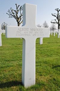 Pfc Albert Misquez enlisted on 12 June 1944.His brother, Pfc Manuel O. Misques, was killed in action in Okinawa, Japan on 6 May 1945. He is buried at Tracy Public Cemetery in Tracy, California.