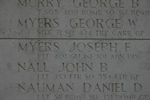 He was awarded the Distinguished Service Cross posthumously. The citation reads: While his company was attacking through the Kiekberg woods about two and one half miles south of Groesbeek, Holland, Lt Myers personally led his machine gun section which had the assignment of giving supporting fire to the advance of the 1st and 2nd rifle platoons. An enemy pocket of resistance consisting of five men armed with a machine gun, machine pistols, and grenades surprised Lt Myers and five men near him by tossing a grenade at the group. The first grenade missed, a second one was tossed and landed in the midst of Lt Myers' group. Upon seeing the grenade Lt Myers yelled, "Grenade, duck!" Realizing that the entire group might be killed or wounded, he without hesitancy threw himself upon the grenade in an attempt to protect his men. The exploding grenade mortally wounded Lt Myers, but his men escaped injury. This demonstration of willingness to make the supreme sacrifice that others might live to fight for a just cause exemplifies the highest traditions of the military forces of the United States.