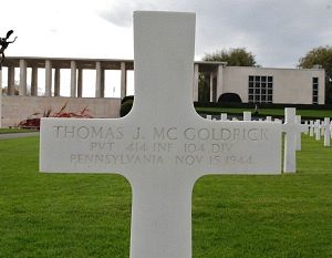 Pvt Thomas J. Mc Goldrick was a lumberman before he enlisted in Allentown, Pennsylvania on 25 November 1942.Source of information: Raf Dyckmans, Astrid van Erp, Ronald van Beek, Peter Schouteten, www.wwiimemorial.com, www.archives.gov - WWII Enlistment Record, www.ancestry.com - Headstone and Interment Records / Boyce Family Tree / Veteran Compensation Application File