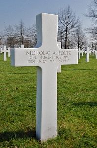 Nicholas Foltz enlisted on 19 November 1942, Cincinnati, Ohio.Source of information: Astrid van Erp, Terry Hirsch, www.wwiimemorial.com, www.ancestry.com - Headstone and Interment Record / 1930 Census, The Cincinnati Enquirer 8 April 1945, www.findagrave.com