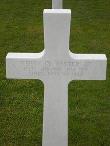 1st Lt Perry O. Tester was a solicitor before he before he enlisted in Toledo, Ohio on 21 August 1942.He was awarded the Distinguished Service Cross posthumously. The citation cited: For extraordinary heroism in connection with military operations against an armed enemy while serving with an Infantry Company of the 413th Infantry Regiment, 104th Infantry Division, in action against enemy forces from 28 to 30 November 1944, in Germany. When four enemy machine guns opened fire upon his platoon, First Lieutenant Tester, throwing hand grenades and firing his carbine, advanced far forward of his men in an assault which resulted in the complete destruction of the weapons and crews in vicious close-in fighting. While his company withdrew to reorganize for a continuation of the attack, he remained behind, and in the face of intense fire carried a wounded soldier 1,000 yards to an aid station. Leading another assault two days later, First Lieutenant Tester was severely wounded by a shell fragment. Administering medical aid to himself, First Lieutenant Tester, despite his pains, continued to lead his platoon in the attack until he was again hit by artillery fire and mortally wounded. First Lieutenant Tester's gallant leadership, personal bravery and zealous devotion to duty at the cost of his life, exemplify the highest traditions of the military forces of the United States and reflect great credit upon himself, the 104th Infantry Division, and the United States Army.